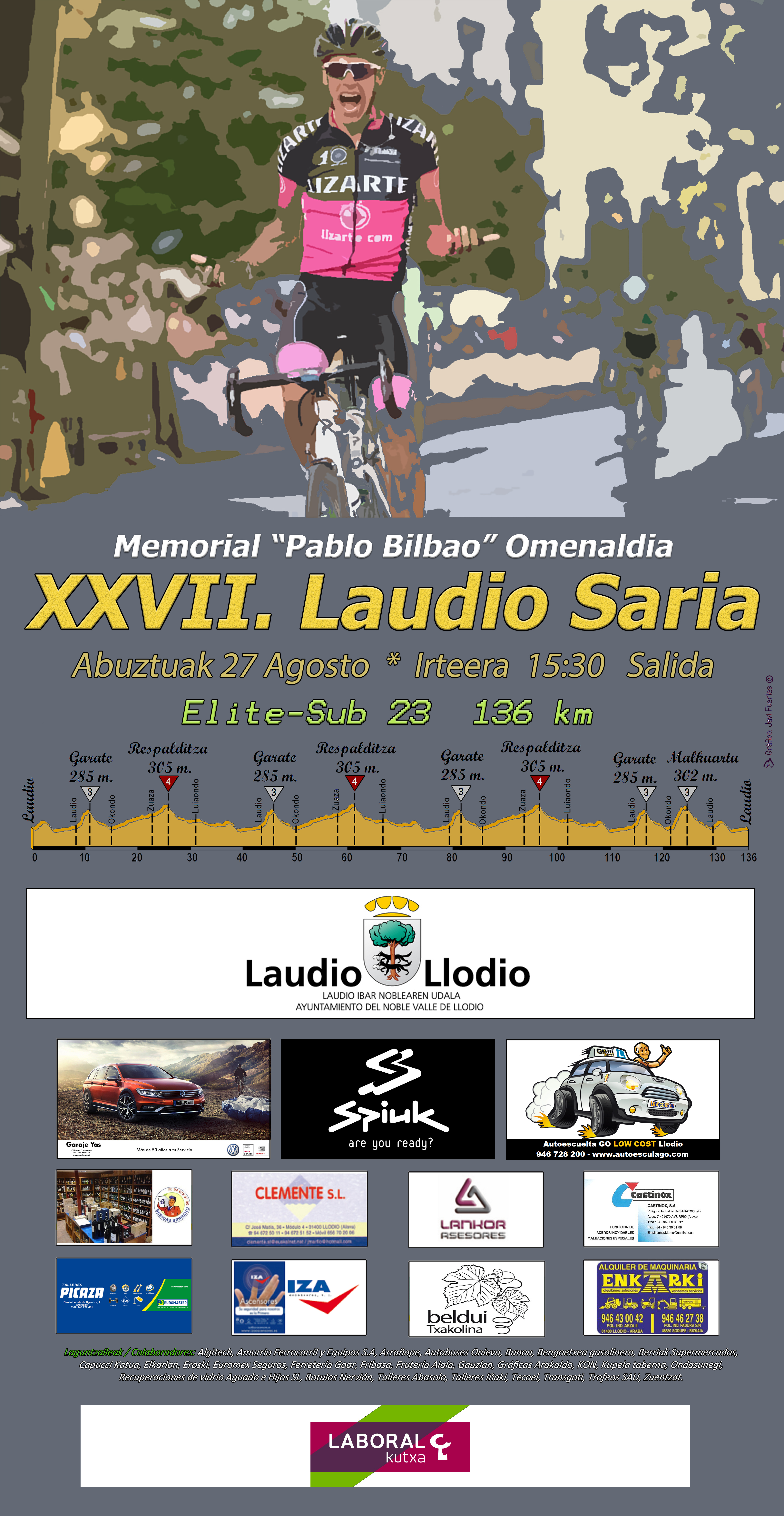 El próximo 27 de agosto día de «Morcillas» y siguiendo con la tradición de pruebas ciclistas en las fiestas de San Roque, celebramos una nueva edición del “Laudio Saria-Pablo Bilbao Omenaldia”. Prueba de categoría elite y sub23 encuadrada en el torneo Euskaldun.